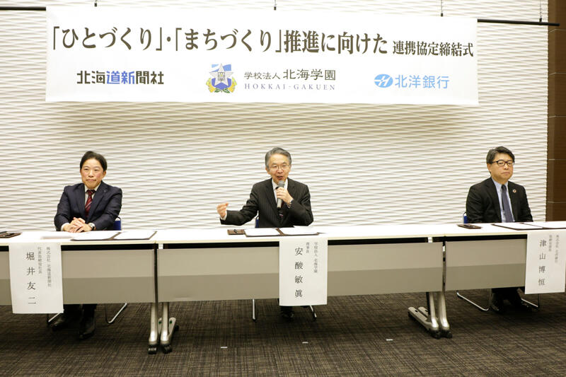 学校法人北海学園は、2025年12月10日、株式会社北海道新聞社(代表取締役社長 堀井友二様)、株式会社北洋銀行(頭取 津山博恒様)と「ひとづくり」・「まちづくり」推進に向けた連携協定を締結いたしました。